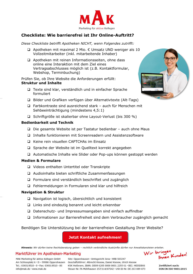 Seit dem 28. Juni 2025 ist das Barrierefreiheitsstärkungsgesetz (BFSG) in Kraft getreten und damit wird digitale Barrierefreiheit für viele Online-Angebote verpflichtend. Auch Apotheken müssen sicherstellen, dass Barrierefreiheit auf Ihren Websites gegeben ist, damit alle digitalen Dienste für jeden Menschen zugänglich sind, unabhängig von ihren körperlichen oder geistigen Fähigkeiten. Rechtsanwalt Dr. Timo Kieser erklärt im Webinar, welche rechtlichen Vorgaben das Barrierefreiheitsstärkungsgesetz (BFSG) mit sich bringt und welche Risiken bei Nichtbeachtung drohen. Zusammen mit Daniel Kiesow, Geschäftsführer der MAK Marketing für aktive Kollegen GmbH, zeigen sie klare Handlungsschritte auf und geben Expertenwissen aus erster Hand zum Beispiel, wie Apotheken ihre Website technisch, gestalterisch barrierefrei, praxisnah, effizient und gesetzeskonform umsetzen können.