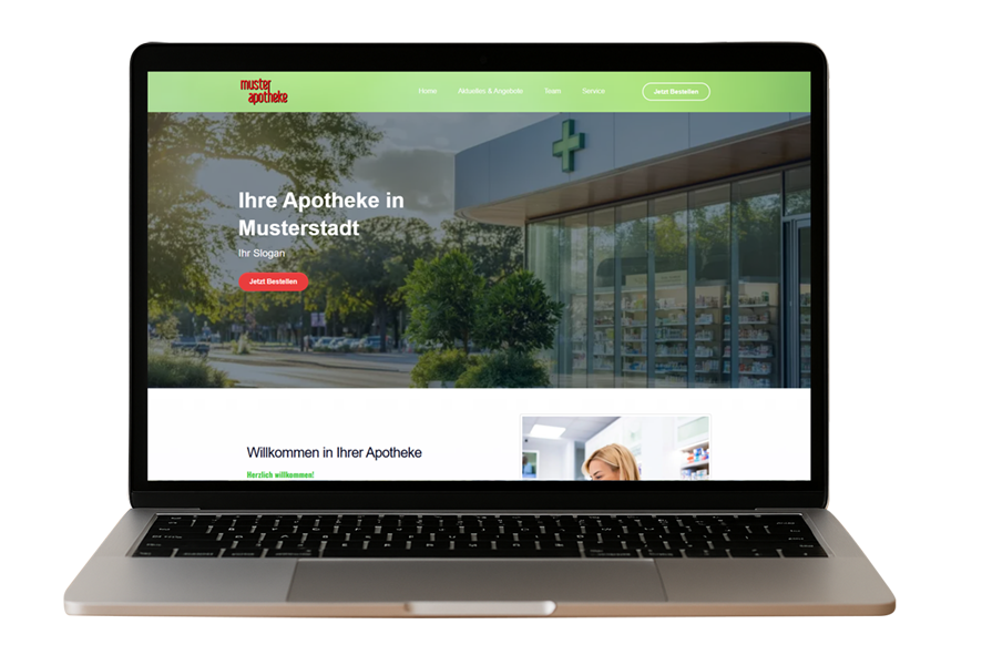Das Bild zeigt einen geöffneten Laptop mit einer Beispiel-Website für Apotheken. Auf dem Bildschirm ist die Startseite einer fiktiven „Musterstadt-Apotheke“ zu sehen, inklusive Navigation, Foto der Apotheke und einem roten „Jetzt Bestellen“-Button. Die Gestaltung ist übersichtlich, freundlich und professionell. Diese Darstellung unterstreicht, wie Apotheken mit einer modernen Website ihre Kunden digital erreichen und Service sowie Vertrauen online erlebbar machen können.